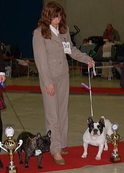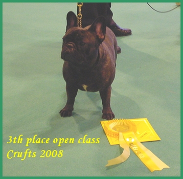 With 5 qualifications we went to the biggest Dogshow on earth: The Crufts show in Birmingham (.U.K.). For this show there were 121 registered entry's for the French Bulldog. The most wellknown breeders from England were present, and additional some nice Frenchies from abroad. Pink presented herself marvelously and became 3th in the highly competitive open class. De best of breed winner became 1th in the same class. Of course we are extremely proud of our Pinky.