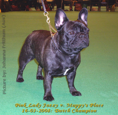 Another great achievement by our Pink. Pink Lady already had aquired more then enough CAC-points for the Dutch Championship, but she was still too young. To aquire this Big Title, Pink Lady had to reach the age of 27 months. On the 29th of januar 2008 Pink has reached that age. On the first show from that date she became second, but on the next one she already achieve this goal. On the show in Leiden Pink Lady got the CAC-CACIB points en became Dutch Champion (age: 28 months). From our Frenchies she is the fourth who abtained this Title, but Pink Lady did it on rollercoaster-speed. With our gratitude to mr. Boelaars who made her Best Bitch in Leiden. We are again extremely proud of Pink's achievements.
