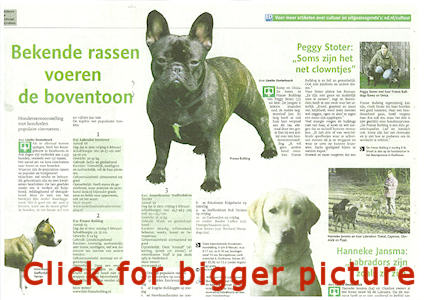 We had a great time on the exhibition in Eindhoven. Not only because of the results. The French Bulldog was the number 2 of most popular dogs in this show. From the top three was a big item in the Eindhovens Journal. On the FrontPage a picture of Pink as intro. And on the middle pages a big picture from Pink as accessory to the article about the French Bulldog. Also there had been an interview with Peggy, who is on the other picture with Romy and Unica (Unica is a daughter of Harlequin Babe v. Muppy's Place). Great to see them in this newspaper.