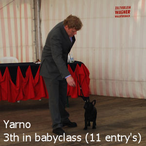 Then we got a break, the bitches would later be judged by mevr. Wil Vries-Hoogland. Inbetween, we had to enter the ring, because of the explanation on the French bulldog with all French Bulldogs as the breed of the day. Mr Dick Baars told what important information about the breed which was extra examined with examples from the group. Shortly  after this we could start with the bitches. Of course to begin with the baby’s. Thank you Tessa for your help on this day. She went with Ymani in the ring and I walked with Yadore. Astrid showed with Yazzlin and Maria with Zingara (a great-grandchild of our Harlequin).