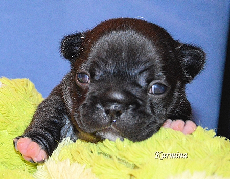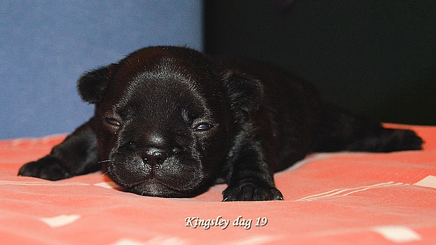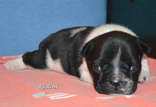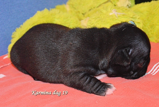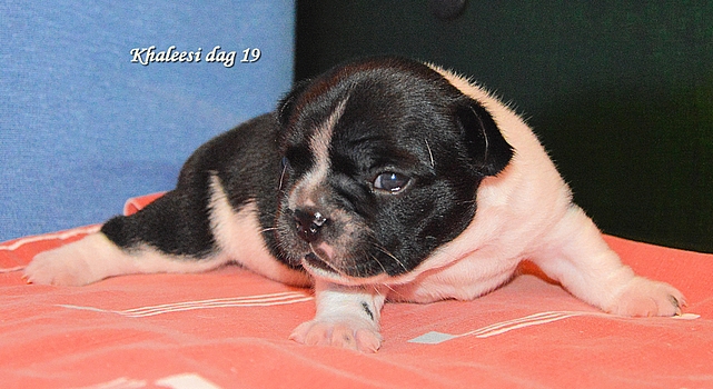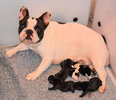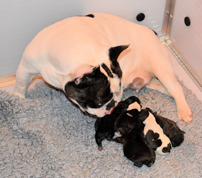 Foto's van het vijftal 24 uur jong....en een blije, zorgzame en relaxte moeder Twee bonte teefjes, een gestroomd teefje en twee gestroomde reutjes Helaas heeft Kensington het niet gered, maar we richten ons volledig op dit mooie viertal.