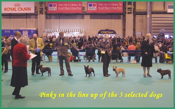 Met 5 kwalificaties op zak, zijn we op weg gegaan naar de grootste Hondenshow ter wereld: De Crufts show in Birmingham (U.K.). Voor deze show waren 121 geregistreerde inschrijvingen van de Franse Bulldog. De meeste bekende fokkers uit Engeland waren aanwezig, en daarbij nog enkele mooie bullen uit het buitenland. Pink showde zich weer geweldig en werd 3e in de hoog competitieve open klas. De beste van het ras werd 1e in dezelfde klasse. Natuurlijk zijn we weer supertrots op onze Pinky.
